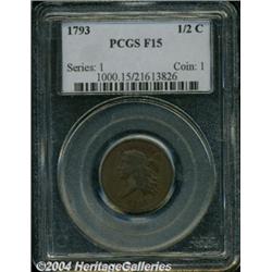 <B>1793<1/2 C> Fine 15 PCGS.</B></I> B-4, C-4, R.3. This is a lovely example with moderate wear, yet no distracting problems of any sort. The smooth tan surfaces have slightly darker brown devices and light red patina on each side. One tiny nick on Liberty's neck keeps this from choice quality for the grade. <BR><BR><B>Important notice:</B> Heritage usually auctions material at the rate of 200-250 lots per hour. On some occasions eBay Live bid software or the Internet may not be able to keep up with the pace of the auction. We recommend placing a realistic absentee bid now as insurance to avoid disappointment. Occasionally the auctioneer may eliminate or reject an eBay Live bid, and the auctioneer may also reopen a lot after the close of the eBay live bidding (usually because we missed an audience bid), and may reject your bid even if it shows you as the winning bidder. By bidding via eBay Live, you agree that Heritage may award the lot to another bidder at its sole discretion under the circumstances described above or any other reasonable circumstances. Since eBay bids are not shown to us until we open the lot on the floor, we treat those bids just like floor bids. In most cases the floor responds before the eBay bid is presented to us, due to Internet lag time, so for consistency we have made it a policy that floor bids are always considered first over tie eBay live bids. Also please note that all Heritage lots purchased through eBay Live carry a 20% Buyer's Premium. Please make sure you read the Terms and Conditions before you bid. </span></font></tr></table></td></tr></table>