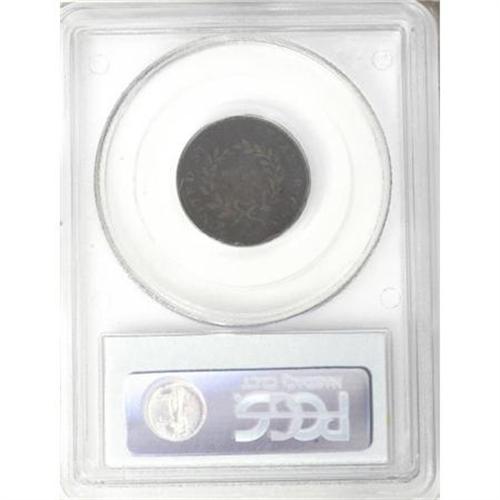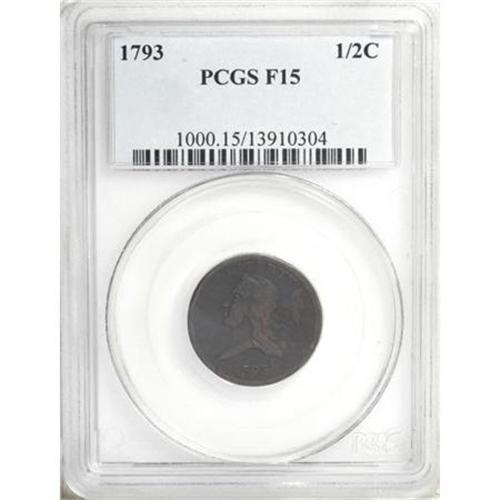 <B>1793 1/2 C Fine 15 PCGS.</B></I> C-1, B-1, High R.3. The lower bust line is curved smoothly into the bottom hair strand on the first obverse. The reverse has a distinct period between the final A and the right stem end. This attractive representative has pleasing dark brown surfaces with lighter tan highlights. A few tiny corrosion spots and several minor rim bruises are evident, but not sufficient to warrant a "no-grade" from PCGS. EAC 7.<BR><BR><B>Coin Engraver:</B> probably Joseph Wright<BR><BR><b>Shipping:</b> Coins & Currency (<a target="_blank" href="http://www.heritageauctions.com/common/shipping.php">view shipping information</a>)