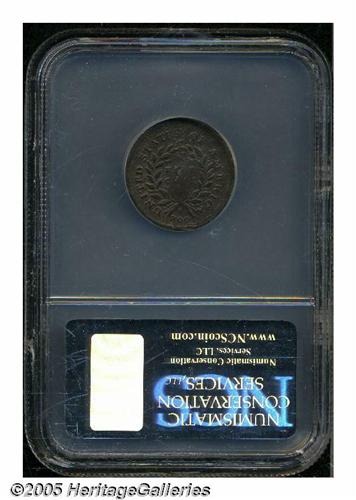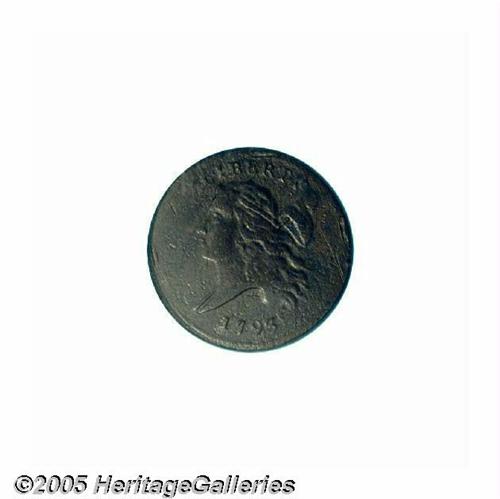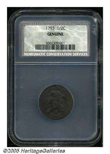 <B>1793<1/2 C> Genuine, NCS.</B></I> B-3, C-3, R.3. This golden-brown first year Half Cent has Very Fine sharpness, but it is moderately porous and has a number of pinscratches. A few short scratches are distributed throughout the borders. The wreath bow and CENT are worn, but the remainder of the devices and legends are clear. The reported mintage of 35,334 pieces is divided between four die varieties of roughly equal scarcity.