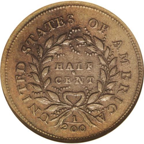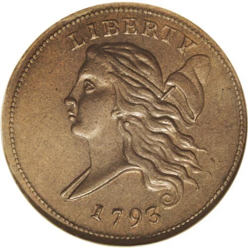<B>1793<1/2 C> Straight Cap MS61 Brown NGC.</B></I> C-3, B-3, R.3. The 1793 Liberty Cap has obvious significance as the first Half Cent produced by the Mint, and is also a highly coveted one-year type. In the informative <I>Encyclopedia of United States Half Cents: 1793-1857</B></I> Breen wrote that the Philadelphia Mint prepared two obverse and three reverse dies for this issue between April and July, 1793. The obverse design was based on sketches prepared by David Rittenhouse, who in turn relied heavily on Augustin Dupre's attractive Libertas Americana medal of 1782. On July 20, the first 7,000 pieces were produced, followed by 24,934 coins on July 26, and a further 3,400 pieces on September 18. These three deliveries totaled a mere 35,334 coins.<BR> The surfaces on this extraordinary Mint State representative are an appealing medium brown color with hints of faded pinkish-orange that is primarily seen in the peripheral areas of the reverse. The highpoints of the devices are uniformly bold and none of the usual porosity, corrosion, or other problems that so often mar these important early coppers are visible. In researching the presently offered Uncirculated rarity, we note that in Breen's Condition Census roster the Clarke/Bareford specimen was listed as Uncirculated and "Identifiable by a tiny nick on the reverse rim over F of OF." While we cannot conclusively say that the coin offered here is indeed the Bareford piece, there is a small contact mark in the exact location as described by Breen. Either way, the Condition Census status of this high quality 1793 Half Cent is secure, making it a landmark offering for the quality conscious collector. EAC 55.<BR><I>From The Chief Paduke Collection.</B></I>