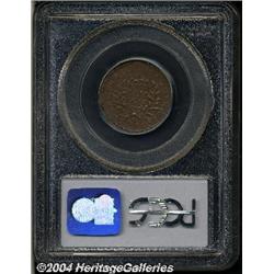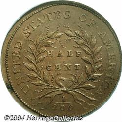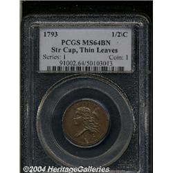 <B>1793<1/2 C> Straight Cap, Thin Leaves MS64 Brown PCGS.</B></I> B-4, C-4, Die State III, R.3. The B-4 is the most frequently encountered of the four 1793 half cent varieties. It is distinguished by the relatively straight cap of Liberty, short 7 in the date, and the longest stems on the lower reverse. Most of the mintage of 3,400 pieces delivered on September 18 are thought to be from this die state. It was believed by Walter Breen that many of this variety were saved as souvenirs, as the first year of issue, and the first design of the denomination. The Condition Census would seem to bear this out as there are a number of high grade examples known.<BR> This is a particularly well defined coin that shows finely detailed hair on Liberty. The leaves on the reverse are not all completely brought up, but several display full venation. The surfaces are unusually bright and glossy with only the slightest area of planchet flaking evident on the right side of the reverse. A very shallow scratch is seen from the center of the obverse to the right rim near 3 o'clock. The diagnostic rust marks are evident in the left obverse field, but these of course have no effect on the coin's grade as all B-4 coins exhibit these to one degree or another. One of the finest 1793 half cents certified by any third-party service. <BR><BR><B>Important notice:</B> Heritage usually auctions material at the rate of 200-250 lots per hour. On some occasions eBay Live bid software or the Internet may not be able to keep up with the pace of the auction. We recommend placing a realistic absentee bid now as insurance to avoid disappointment. Occasionally the auctioneer may eliminate or reject an eBay Live bid, and the auctioneer may also reopen a lot after the close of the eBay live bidding (usually because we missed an audience bid), and may reject your bid even if it shows you as the winning bidder. By bidding via eBay Live, you agree that Heritage may award the lot to another bidder at its sole discretion under the circumstances described above or any other reasonable circumstances. Since eBay bids are not shown to us until we open the lot on the floor, we treat those bids just like floor bids. In most cases the floor responds before the eBay bid is presented to us, due to Internet lag time, so for consistency we have made it a policy that floor bids are always considered first over tie eBay live bids. Also please note that all Heritage lots purchased through eBay Live carry a 20% Buyer's Premium. Please make sure you read the Terms and Conditions before you bid.