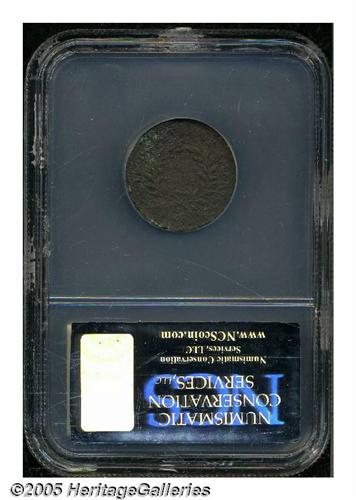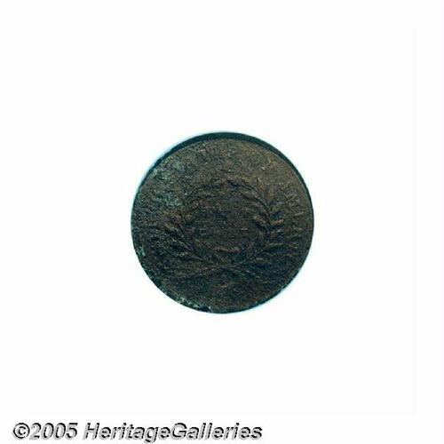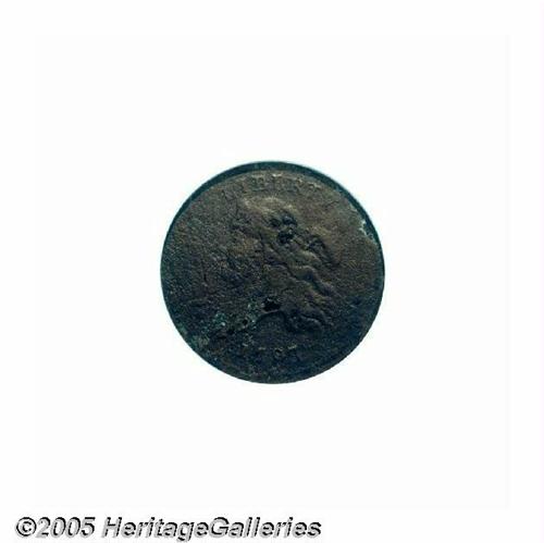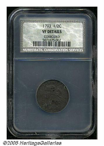 <B>1793<1/2 C> VF Details, Corroded, NCS.</B></I> B-4, C-4, Low R.3. This granular golden-brown example has dashes of aqua or ebony verdigris in selected areas. LIBERTY and the date are bold, while the reverse legends are generally faint. A pair of old pinscratches on the lower left obverse field are of little relevance.