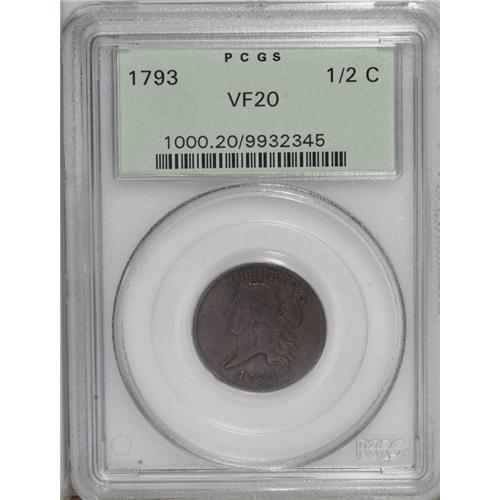 1793 1/2 C VF20 PCGS. C-3, B-3, R.3. Golden-brown with