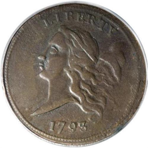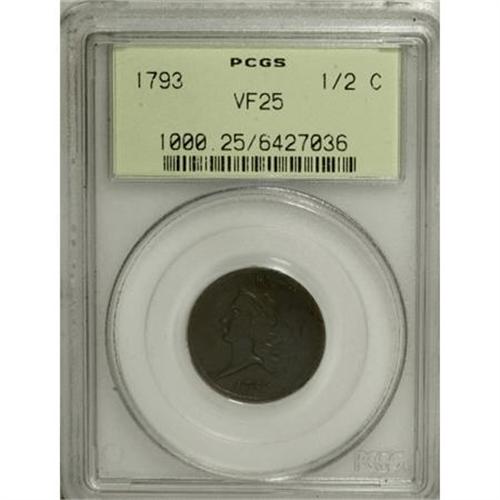 <B>1793 1/2 C VF25 PCGS.</B></I> C-2, B-2. R.3. The forelock is below IB in LIBERTY with the bottom edge of the bust smoothly curved. The right stem end joins the final A in AMERICA. Coinage in the opening year of Mint operations was limited to copper as the legalities of silver and gold production had not been cleared. Chain cents were coined in March, Wreath cents in April, half cents from July to September, and Liberty Cap cents also in September.<BR> Pleasing color, sharp details, and excellent centering are immediately evident when this piece is examined. Microscopic porosity is revealed upon close inspection with light orange color at the borders indicating that it has been cleaned and recolored. EAC 15.<BR><BR><BR><BR><BR><B>Coin Engraver:</B> probably Joseph Wright<BR><BR><b>Shipping:</b> Coins & Currency (<a target="_blank" href="http://www.heritageauctions.com/common/shipping.php">view shipping information</a>\)