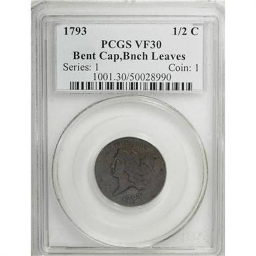 <B>1793 1/2 C VF30 PCGS.</B></I> C-1, B-1, High R.3. Cohen-1 is the first half cent variety struck, and is also the scarcest variety of the year. A branch stem touches the U in UNITED, diagnostic for Cohen-1. This example provides medium lilac toning and lacks the granularity seen on most early half cents, although a pair of inconsequential spots are found near the obverse rim at 2 o'clock. HALF CENT is mostly worn, but all remaining legends are bold except for the final A in AMERICA. Each side has one or two faint thin marks unworthy of further comment. An important single-year type coin, since the bust faces right beginning in 1794. EAC 12.<BR><I>Selections From <a href="http://www.pcgs.com/setregistry/alltimeset.aspx?s=32891" target=_new>Gobrecht's Raisinet Collection</a>, the #1 Finest PCGS Registry Copper, Nickel and Silver Type Set.</B></I><BR><BR><B>Coin Engraver:</B> probably Joseph Wright<BR><BR><b>Shipping:</b> Coins & Currency (<a target="_blank" href="http://www.heritageauctions.com/common/shipping.php">view shipping information</a>)