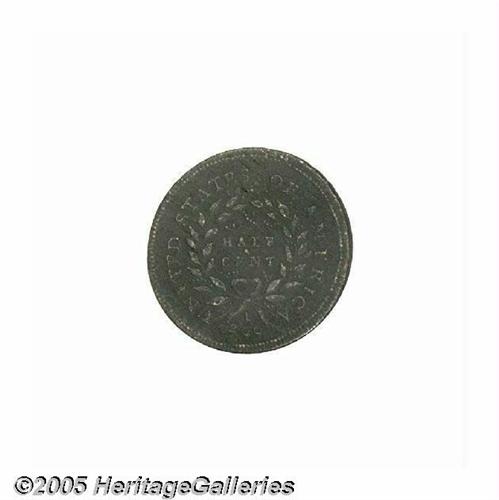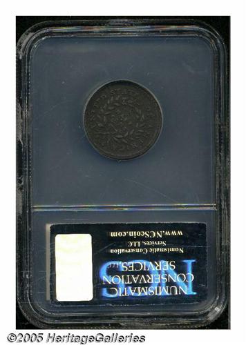 <B>1793<1/2 C> XF Details, Corroded, NCS.</B></I> B-2, C-2, R.3. An impressively defined but granular lilac-brown example. The reverse is more smooth than the obverse. Close inspection does not locate any remotely mentionable marks. The dies are widely rotated clockwise. Liberty faces left on the 1793 Half Cents, unlike all other dates and denominations from the Philadelphia Mint during the eighteenth century.