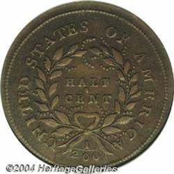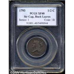 <B>1793<1/2 C> XF40 PCGS.</B></I> B-3, C-3, R.3. The obverse is pale olive-brown in color with hints of rose hues on the highpoints, while the reverse is predominately light lavender-brown, although areas of medium tan patina are found near the denomination. A tiny ding on the reverse before 5 o'clock and a few short and inconspicuous pinscratches on the obverse field do not distract the eye. All major details of the design are bold on this 1793 Half Cent, which represents the first year of the denomination and the only year of the Bust Left Liberty Cap Type. Many an early copper type set lacks a sharp example of this desirable type.<BR><I>From The Karl Scheible Collection.</B></I> <BR><BR><B>Important notice:</B> Heritage usually auctions material at the rate of 200-250 lots per hour. On some occasions eBay Live bid software or the Internet may not be able to keep up with the pace of the auction. We recommend placing a realistic absentee bid now as insurance to avoid disappointment. Occasionally the auctioneer may eliminate or reject an eBay Live bid, and the auctioneer may also reopen a lot after the close of the eBay live bidding (usually because we missed an audience bid), and may reject your bid even if it shows you as the winning bidder. By bidding via eBay Live, you agree that Heritage may award the lot to another bidder at its sole discretion under the circumstances described above or any other reasonable circumstances. Since eBay bids are not shown to us until we open the lot on the floor, we treat those bids just like floor bids. In most cases the floor responds before the eBay bid is presented to us, due to Internet lag time, so for consistency we have made it a policy that floor bids are always considered first over tie eBay live bids. Also please note that all Heritage lots purchased through eBay Live carry a 20% Buyer's Premium. Please make sure you read the Terms and Conditions before you bid. </span></font></tr></table></td></tr></table>