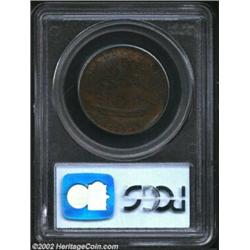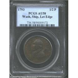 1793 1/2P Washington Ship Halfpenny, Copper, Lettered Edge AU58 PCGS. Baker-18, R.3. The fields have tan-brown color, while the devices are generally purple-brown in patina. The centers have minor planchet flaws, as made, and Washington has a hint of rub on his cheekbone. Listed on page 59 of the 2003 Guide Book. Population: 8 in 58, 3 finer (10/02). Important notice: We expect to be auctioning lots at the rate of 200-250 per hour. Sometimes eBay Premier live bid software cannot keep up with that pace, so we strongly recommend that you place a realistic proxy bid now as insurance to avoid disappointment. Also please note that all Heritage/CAA lots purchased through eBay Premier carry a 20% Buyer's Premium. Please make sure you read the Terms and Conditions.