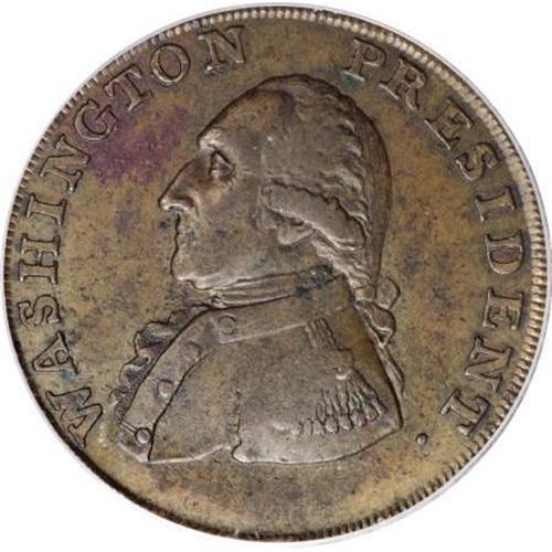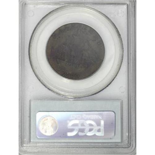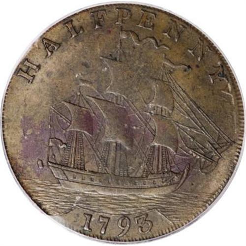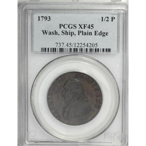 <B>1793 1/2P Washington Ship Halfpenny, Copper, Plain Edge XF45 PCGS.</B></I> Breen-1226, R.8. The 1965 update has a marginal note about this piece at the listing for Baker-18, the note written by George Fuld. Struck from the standard dies for the Ship halfpenny, except it has a plain edge. It is a late die state with heavily buckled dies, as Breen described at his <I>Encyclopedia </B></I>entry 1225.<BR> In his reference, Breen mentions the existence of just three known examples of the plain edge variation: 1. Unlocated British Collection; 2. George Fuld; John Roper (Stack's, 12/1983), lot 376; 3. New Jersey specialist; 1975 EAC Sale (Pine Tree, 2/1975), lot 491.<BR> Examination of the plates in the 1975 EAC catalog and the 1983 Roper catalog clearly show that they are the identical piece, instead of different examples. The present specimen, while similar in quality and appearance to the Roper coin, is clearly a different specimen. It seems possible that either this piece or the Roper coin could be the same as the British specimen mentioned by Breen. He assumed his British Collection specimen must exist, as it was listed in a 1910 British reference, yet he had never actually seen the coin, and apparently no one else had either.<BR> Considering the above, we feel safe suggesting that there are just two or three known plain edge pieces. Both sides of this specimen have smooth olive-brown surfaces with splashes of darker brown. Small areas of maroon patina are evident on each side, much as they are on the Roper coin, but in different locations. An extraordinary opportunity for the advanced Colonial collection or the specialist in Washingtonia.<BR><BR><b>Shipping:</b> Coins & Currency (<a target="_blank" href="http://www.heritageauctions.com/common/shipping.php">view shipping information</a>)