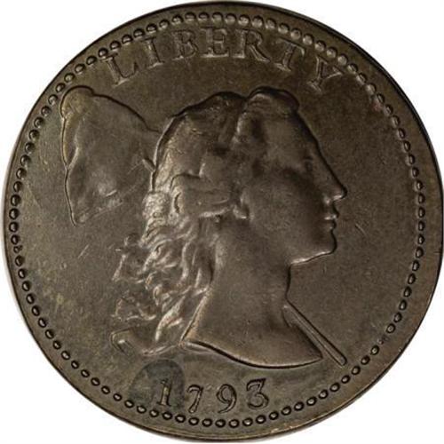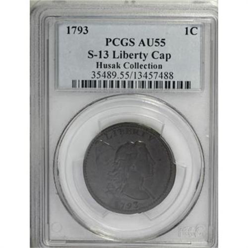 <B>1793 1C Liberty Cap. AU55 PCGS. S-13, B-20, Low R.4. </B></I> <B>Bland AU50; tied for CC-2. Noyes AU50; tied for CC-2. Photo #20425. Our EAC Grade AU50.<BR><BR>Equivalents.</B></I> Crosby-Levick 10J; Frossard 11.1; Proskey 13; Doughty 14; Crosby 12-L; McGirk 3-B; EAC 20; <I>Encyclopedia</B></I> 1647; PCGS #1359.<BR><B><BR>Variety.</B></I> L touches bead, two beads over I. Leaf triplet is positioned below OF. The obverse appears on S-12 and S-13. The reverse appears on S-13, S-14, S-16, and NC-6. Lettered Edge, one leaf.<BR><B><BR>Surfaces. </B></I>Glossy dark brown surfaces are smooth and free of abrasions, except for a few tiny marks on the obverse. Considerable mint frost remains with exceptional field reflectivity, especially on the obverse. A small patch of darker steel toning surrounds the digit 1 in the date.<BR><B><BR>Die State II.</B></I> An early State II example with extremely faint evidence of the reverse bulge at NT.<BR><B><BR>Appearances.</B></I> The obverse is illustrated on the Crosby-Levick plate, in <I>Early American Cents,</B></I> and in <I>Penny Whimsy.</B></I> The obverse and reverse are illustrated in <I>The United States Coinage of 1793</B></I> by S.S. Crosby and in Noyes (1991 and 2006).<BR><B><BR>Census.</B></I> A single specimen from the Eliasberg Collection is the only Mint State 1793 Cap cent known. The Husak piece and one or two others are next in the Condition Census. Del Bland and Bill Noyes disagree about the early provenance of this specimen. In his <I>Official Condition Census,</B></I> Noyes begins the provenance of this piece with "H. Whiteley; B.H. Collins" and makes no mention of its earlier appearance on the Crosby-Levick plate. For this reason, we believe that Bland's provenance presented below is more accurate. The finest piece in the ANS grades just XF40.<BR><BR><B>Commentary.</B></I> In <I>Henry Voight and Others Involved in America's Early Coinage,</B></I> Karl Moulton reproduced a portrait of Joseph and Sarah Wright with their three children. His belief that Sarah Wright was the model for the Libertas Americana Medal, the 1792 disme, the 1792 quarter, and the 1793 half cent is based on a comparison of the portrait with the profile on those pieces. Later in his reference, Moulton reproduced a sketch of Wright's mother, Patience. She is depicted holding a pole and cap, leading Moulton to believe this was the sole inspiration for the Liberty Cap design initially used on the Libertas Americana medal.<BR><BR>Although approximately 150 to 200 examples of this variety survive, most are in lower grades. Bill Noyes records just 18 pieces that he calls VF or better. The challenge of obtaining such pieces was known to Ed. Frossard when he compiled his 1879 <I>Monograph:</B></I> "The Liberty Cap cents are scarce even in worn or poor condition; good specimens are nevertheless obtainable, but the fastidious collector who wants only extremely fine specimens will find it difficult to match one of the Wreath type with a Liberty Cap cent of this date."<BR><BR>In 1949, Sheldon commented: "Of about the same rarity as the 1-A [Sheldon-1], and the same comment can be made concerning the frequent exaggeration of rarity and condition. In condition VF-20 or better I have seen perhaps twenty 12-L's and possibly a hundred of lower grade." Nearly 60 years later, the number of VF or better pieces is unchanged, but the number of collectors seeking such pieces has increased dramatically.<BR><BR><B> </B></I>Joseph Wright, hired as the first actual engraver at the Mint, introduced hubbed dies during the summer of 1793. A hub was essentially a separate die, but finished in relief with a positive image that appeared exactly as the finished coin. Once prepared, the hub was placed in the upper or hammer position of a screw press, and a die blank was placed in the anvil or lower position of the press. A process of repeated blows and annealing would slowly impart the design of the hub into the die blank, until all of the detail was complete. Once finished, the die was completed by lapping to remove extraneous material. The earliest hubs contained just the central device. It was not until 1835 that complete hubs were used on a regular basis.<BR><BR><B>Provenance.</B></I> <I>Joseph Mickley; W. Elliot Woodward (10/1867), lot 1933, $55; L. Bayard Smith; Virgil M. Brand (2/1941); B.G. Johnson (St. Louis Stamp & Coin Co.); Henry C. Hines; Carl Wurtzbach (1945); Dr. William H. Sheldon; Sheraton Coin Co.; Ernest Henderson (1958); Dorothy Paschal (1959); Dr. William H. Sheldon (4/1972); R.E. Naftzger, Jr. (2/1992); Eric Streiner; Jay Parrino; Superior (2/1998), lot 790, $90,750.</B></I><BR><BR>At the Superior sale, Walter Husak outbid Denis Loring for this coin. The two were sitting next to each other in the back of the room, hands in the air, exchanging comments as the bidding went higher and higher.<BR><BR><B>Personality.</B></I> <B>Joseph J. Mickley</B></I> was born near Bethlehem, Pennsylvania, on February 24, 1799, and moved to Philadelphia in 1818 to learn the piano-making trade, a field that held his attention for the next 50 years. He was married twice and had six children. Mickley has been dubbed "the father of American numismatics" due to his search for a large cent from the year of his birth. He is also known for various coin collecting activities, and reportedly purchased leftover dies that the Mint sold as scrap metal. Among them was a pair of dies used for the 1823 "restrike" large cents. The restrike dies are still in existence today. W. Elliot Woodward sold much of his collection, including this coin, at auction in October 1867, following a robbery that greatly diminished his collecting enthusiasm. Mickley wrote a pamphlet titled <I>Dates of United States Cents and Their Degree of Rarity.</B></I> He was depicted on several contemporary medals, including one issued in 1867 when he was president of the Numismatic and Antiquarian Society of Philadelphia. Before his death on Fe