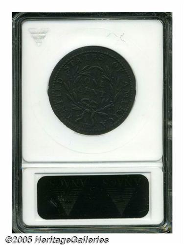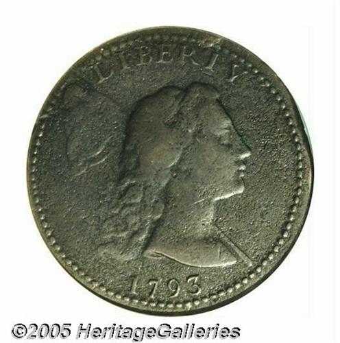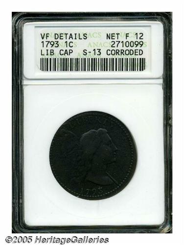 <B>1793<1C> Liberty Cap--Corroded--ANACS. VF Details, Net Fine 12.</B></I> S-13, Low R.4. The 1793 Liberty Caps are arguably the most famous and highly sought out design type among early coppers. Breen estimates that only 250 Liberty Cap cents dated 1793 exist in all grades and of all varieties. Well struck at the rims as well as across the reverse, this piece only shows weakness in the center of the obverse with profound weakness on the hair curls over the ear of Liberty. Otherwise, the surfaces are deeply toned with steel-brown color. Remarkably free from most abrasions, the most notable surface distraction is some notable porosity over each side resulting in the net grade. One ancient, vertical scratch is also seen near Liberty's ear. A highly collectible piece.