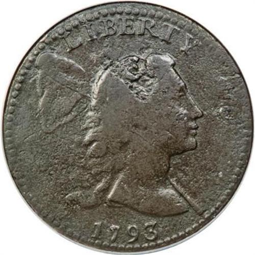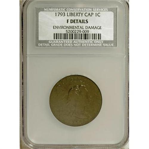 <B>1793 1C Liberty Cap--Environmental Damage--NCS. Fine Details.</B></I> S-13, B-20, Low R.4. Advanced large cent collectors know the virtual impossibility of securing a sharply defined 1793 Liberty Cap cent, the rarest of the three major 1793 design types. This deep brown piece is moderately granular aside from roughness on the top of the head. A strong light reveals light pinscratches near ONE CENT and a faded, deeper linear mark from the cap to the neck. The reverse is slightly misaligned toward 12:30. EAC 7.<BR><BR><b>Shipping:</b> Coins & Currency (<a target="_blank" href="http://www.heritageauctions.com/common/shipping.php">view shipping information</a>)