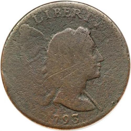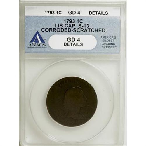 <B>1793 1C Liberty Cap--Corroded, Scratched--ANACS. Good 4 Details.</B></I> S-13, B-20, Low R.4. The variety is confirmed by two beads over the I in LIBERTY, and a triple leaf under the O of OF. Light to medium brown surfaces reveal light porosity, and a few obverse toned over pinscratches. Liberty's portrait exhibits raised edges, as does most of the reverse wreath. The date and LIBERTY are relatively strong. EAC 3.<BR><BR><B>Coin Engraver:</B> Joseph Wright<BR><BR><b>Shipping:</b> Coins & Currency (<a target="_blank" href="http://www.heritageauctions.com/common/shipping.php">view shipping information</a>)