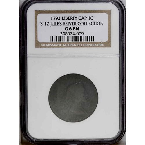 <B>1793<1C> Liberty Cap. S-12, B-21, Low R.6. Good 6 NGC and EAC.</B></I> Die State II. Just shy of the latest die state known with a pronounced bulge at the center of the reverse, but not encroaching upon the peripheral lettering. This example is tied for 12th finest known of the variety. As a group, the 1793 Liberty Cap cents are rare. This die marriage, S-12, is known to the extent of about 25 pieces, perhaps 30 at the very most. Dark steel surfaces, slightly lighter on the devices, with a few tiny surface marks and faint rim bruises.<BR><I>Ex: James Macallister; Charles Dupont (Stack's, 9/1954), lot 20; Dr. Charles Ruby via Denis W. Loring (Superior, 2/1975), lot 13.</B></I> Envelope Included.