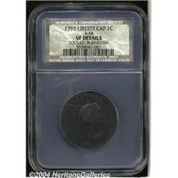 <B>1793<1C> Liberty Cap--Tooled, Burnished--NCS. VF Details.</B></I> S.14, High R.4. The net grade of this example is probably about Fine-12; although everyone will view this from a slightly different angle. This is the popular and instantly identified Bisecting Crack variety. The obverse has a nearly vertical die crack from top to bottom from the E of LIBERTY to Miss Liberty's ear, and on to the 3 in 1793. The die apparently cracked during engraving or hardening, as every known example of this variety has this crack. This variety has been given a rarity rating of Low Rarity 5 by Del Bland; however, we believe that High Rarity-4 is more accurate. Not at all unattractive despite the burnishing that is primarily visible on the obverse. While NCS has described this with two terms--tooling and burnishing--this is essentially a burnished coin. In essence, burnishing is a form of tooling, thus using both terms is redundant.<BR><I>From The Paulsboro Collection, Part Three.</B></I> <BR><BR><B>Important notice:</B> Heritage usually auctions material at the rate of 200-250 lots per hour. On some occasions eBay Live bid software or the Internet may not be able to keep up with the pace of the auction. We recommend placing a realistic absentee bid now as insurance to avoid disappointment. Occasionally the auctioneer may eliminate or reject an eBay Live bid, and the auctioneer may also reopen a lot after the close of the eBay live bidding (usually because we missed an audience bid), and may reject your bid even if it shows you as the winning bidder. By bidding via eBay Live, you agree that Heritage may award the lot to another bidder at its sole discretion under the circumstances described above or any other reasonable circumstances. Since eBay bids are not shown to us until we open the lot on the floor, we treat those bids just like floor bids. In most cases the floor responds before the eBay bid is presented to us, due to Internet lag time, so for consistency we have made it a policy that floor bids are always considered first over tie eBay live bids. Also please note that all Heritage lots purchased through eBay Live carry a 20% Buyer's Premium. Please make sure you read the Terms and Conditions before you bid. </span></font></tr></table></td></tr></table>