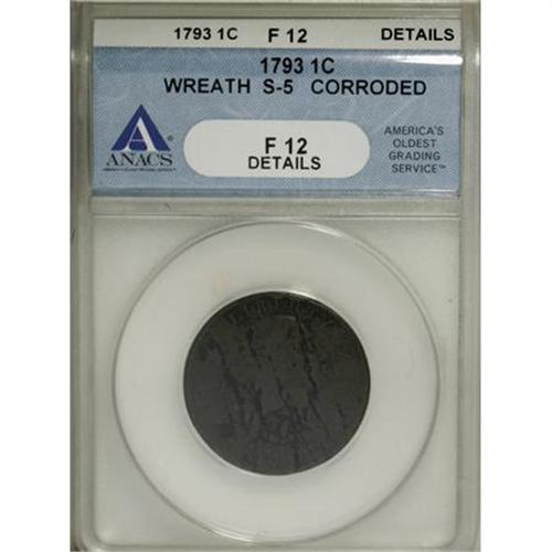 <B>1793 1C Wreath Cent, Vine and Bars--Corroded--ANACS. Fine 12 Details.</B></I> S-5, B-6, R.4. Medium brown with hints of blue and green. The reverse is pleasing, while the obverse has several fissures accompanied by gray verdigris. EAC 4.<BR><BR><b>Shipping:</b> Coins & Currency (<a target="_blank" href="http://www.heritageauctions.com/common/shipping.php">view shipping information</a>)