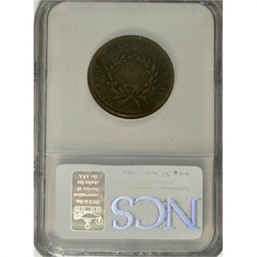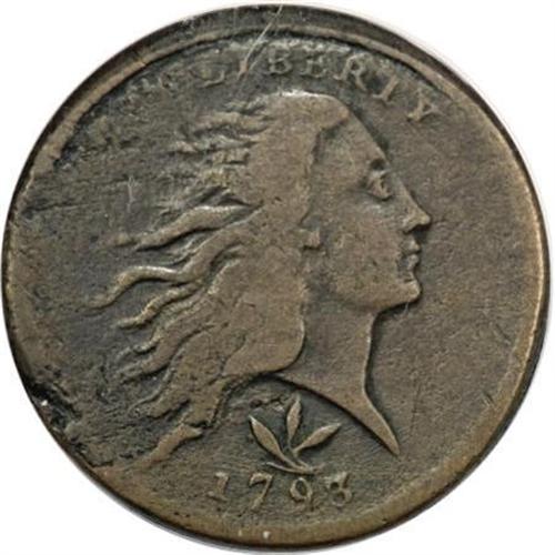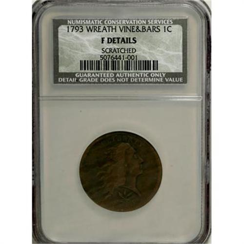 <B>1793 1C Wreath Cent--Vine and Bars, Scratched--NCS. Fine Details.</B></I> S-8, B-13, R.3. This medium brown cent has clear legends, and all berries are distinct. The back of Liberty's head has much hair detail. The left obverse border is granular, and the obverse has a number of wispy pinscratches. The central reverse displays an X. A planchet cutter mark is noted between 5 and 9 o'clock on the reverse. EAC 5.<BR><BR><B>Coin Engraver:</B> Henry Voigt<BR><BR><b>Shipping:</b> Coins & Currency (<a target="_blank" href="http://www.heritageauctions.com/common/shipping.php">view shipping information</a>)