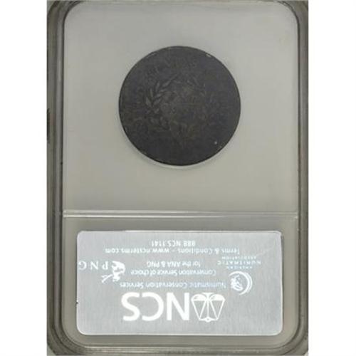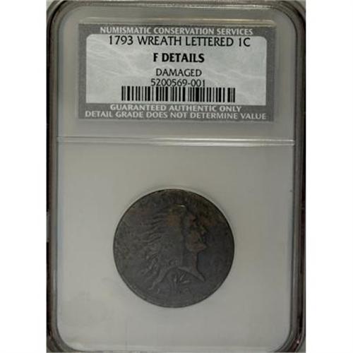 <B>1793 1C Wreath Cent, Lettered Edge--Damaged--NCS. Fine Details.</B></I> S-11c, B-16c, Low R.3. Presumed to be S-11c, although the scarcer S-11b also has a lettered edge, which is obscured by the NCS holder. This is a sharp example with a bold date and clear types. The walnut-brown surfaces display areas of dark gray verdigris, and each side has a few minor rim dings. The obverse field near 12, 1, and 9 o'clock has shallow scrapes where the planchet is rougher, and the right obverse field has hairlines. EAC 4.<BR><BR><b>Shipping:</b> Coins & Currency (<a target="_blank" href="http://www.heritageauctions.com/common/shipping.php">view shipping information</a>)