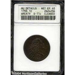 <B>1793<1C> Wreath Cent--Lettered Edge--Cleaned--ANACS. AU Details, Net XF40.</B></I> S-11c, Low R.3. A splendidly detailed example that has been recolored in the past, although the borders are nicely retoned in lavender hues while the centers possess faded orange-tan color. A few minor planchet flaws near the obverse center do not particularly distract. The sprig leans right on this die marriage, while the fraction denominator is entered too far to the right. Clash marks (as made) are noted below Liberty's chin, but the dies are otherwise perfect.<BR><I>From The Willamette Collection.</B></I> <BR><BR><B>Important notice:</B> Heritage usually auctions material at the rate of 200-250 lots per hour. On some occasions eBay Live bid software or the Internet may not be able to keep up with the pace of the auction. We recommend placing a realistic absentee bid now as insurance to avoid disappointment. Occasionally the auctioneer may eliminate or reject an eBay Live bid, and the auctioneer may also reopen a lot after the close of the eBay live bidding (usually because we missed an audience bid), and may reject your bid even if it shows you as the winning bidder. By bidding via eBay Live, you agree that Heritage may award the lot to another bidder at its sole discretion under the circumstances described above or any other reasonable circumstances. Since eBay bids are not shown to us until we open the lot on the floor, we treat those bids just like floor bids. In most cases the floor responds before the eBay bid is presented to us, due to Internet lag time, so for consistency we have made it a policy that floor bids are always considered first over tie eBay live bids. Also please note that all Heritage lots purchased through eBay Live carry a 20% Buyer's Premium. Please make sure you read the Terms and Conditions before you bid. </span></font></tr></table></td></tr></table>