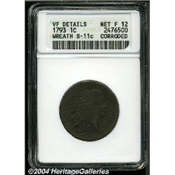 <B>1793<1C> Wreath Cent--Lettered Edge--Corroded--ANACS. VF Details, Net Fine 12.</B></I> S-11c, Low R.3. Moderately corroded, particularly on the reverse, where porosity is more widespread and pronounced. The fields are a dark chocolate brown and highlight the design elements which are a shade or two lighter. The design features are generally clear; save for portions of the fraction that have succumbed to corrosion. <BR><BR><B>Important notice:</B> Heritage usually auctions material at the rate of 200-250 lots per hour. On some occasions eBay Live bid software or the Internet may not be able to keep up with the pace of the auction. We recommend placing a realistic absentee bid now as insurance to avoid disappointment. Occasionally the auctioneer may eliminate or reject an eBay Live bid, and the auctioneer may also reopen a lot after the close of the eBay live bidding (usually because we missed an audience bid), and may reject your bid even if it shows you as the winning bidder. By bidding via eBay Live, you agree that Heritage may award the lot to another bidder at its sole discretion under the circumstances described above or any other reasonable circumstances. Since eBay bids are not shown to us until we open the lot on the floor, we treat those bids just like floor bids. In most cases the floor responds before the eBay bid is presented to us, due to Internet lag time, so for consistency we have made it a policy that floor bids are always considered first over tie eBay live bids. Also please note that all Heritage lots purchased through eBay Live carry a 20% Buyer's Premium. Please make sure you read the Terms and Conditions before you bid.