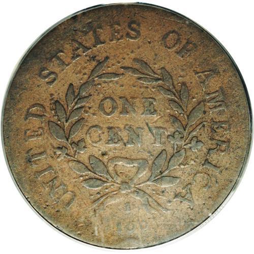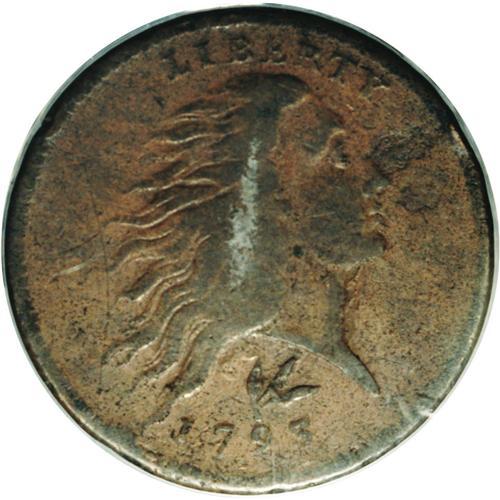 <B>1793<1C> Wreath Cent--Lettered Edge--Fine 15 PCGS.</B></I> Presumably S-11c, Low R.3. The PCGS insert states Lettered Edge, but does not distinguish between the Single Leaf and Double Leaves edge variants. The more available S-11c is assumed. Milky brick-red fields contrast with tan-brown legends and devices. Liberty's hair has a vertical strike of silver color. A few minor edge dings and a small area of grainy surface in front of the nose are noted, but all legends are bold and the types are clear. EAC 8.