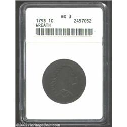 1793 1C Wreath Cent--Vine and Bars--AG3 ANACS. S-9, R.2. Deep brown patina covers each side of this low grade and affordable example. Each side shows a rim bump but the surfaces are otherwise defect-free with evidence of heavy circulation on each side. Important notice: We expect to be auctioning lots at the rate of 200-250 per hour. Sometimes eBay Premier live bid software cannot keep up with that pace, so we strongly recommend that you place a realistic proxy bid now as insurance to avoid disappointment. Also please note that all Heritage/CAA lots purchased through eBay Premier carry a 20% Buyer's Premium. Please make sure you read the Terms and Conditions.