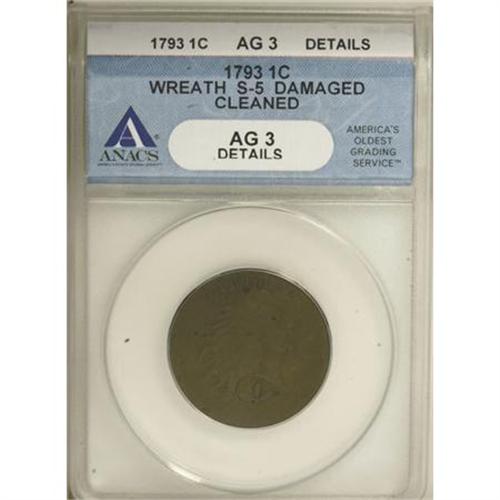<B>1793 1C Wreath Cent--Vine and Bars, Damaged, Cleaned--ANACS. AG3 Details.</B></I> S-5, B-6, R.4. LIBERTY and the profile are bold, as is two-thirds of UNITED STATES OF AMERICA. ONE CENT is faded but legible. The date is well-worn, but the digits can be discerned with proper lighting. Wiped to smooth the surfaces, and a few small pits are distributed. EAC 3.<BR><I>From The John Stimson, Sr. Collection, Part Two.</B></I><BR><BR><b>Shipping:</b> Coins & Currency (<a target="_blank" href="http://www.heritageauctions.com/common/shipping.php">view shipping information</a>)