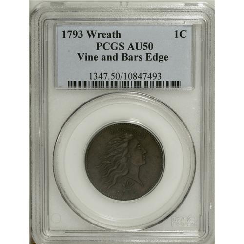 <B>1793 1C Wreath Cent--Vine and Bars--AU50 PCGS.</B></I> S-8, B-13, R.3. An impressive representative of this famous and conditionally challenging single-year Early American type. The medium brown surfaces are generally smooth, and significant luster emerges from Liberty's hair, the wreath, and the legends. The strike is even and precise, with only slight highpoint wear present on the hair. The obverse border has a hint of granularity at 3:30, and light marks are present on Liberty's neck and the E in CENT, but these minor imperfections are accounted for in the designated third party grade. The Wreath cent can always be obtained for a price in corroded, worn-out condition, but examples with remaining luster and undisturbed fields are few and far between. EAC 30.<BR><I>From The Essex Palm Collection.</B></I><BR><BR><b>Shipping:</b> Coin/Currency (<a target="_blank" href="http://www.heritageauctions.com/common/shipping.php">view shipping information</a>)