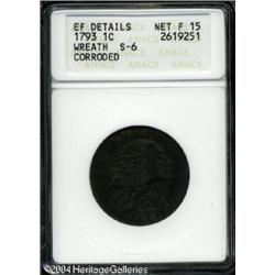 1793 1C Wreath Cent--Vine and Bars--Corroded--ANACS. <B>1793 1C Wreath Cent--Vine and Bars--Corroded--ANACS. XF Details, Net Fine 15.</B></I> S-6, R.3. Steel-gray surfaces with light corrosion over each side. Surprisingly well defined considering the net grade with strong details on Liberty's hair. <BR><BR><B>Important notice:</B> Heritage usually auctions material at the rate of 200-250 lots per hour. On some occasions eBay Live bid software or the Internet may not be able to keep up with the pace of the auction. We recommend placing a realistic absentee bid now as insurance to avoid disappointment. Occasionally the auctioneer may eliminate or reject an eBay Live bid, and the auctioneer may also reopen a lot after the close of the eBay live bidding (usually because we missed an audience bid), and may reject your bid even if it shows you as the winning bidder. By bidding via eBay Live, you agree that Heritage may award the lot to another bidder at its sole discretion under the circumstances described above or any other reasonable circumstances. Since eBay bids are not shown to us until we open the lot on the floor, we treat those bids just like floor bids. In most cases the floor responds before the eBay bid is presented to us, due to Internet lag time, so for consistency we have made it a policy that floor bids are always considered first over tie eBay live bids. Also please note that all Heritage lots purchased through eBay Live carry a 20% Buyer's Premium. Please make sure you read the Terms and Conditions before you bid. This lot is being auctioned in conjunction with a live floor auction by Heritage Galleries & Auctioneers. All final auction and invoice information will be supplied by Heritage Galleries & Auctioneers, and all other information should be considered preliminary. Lot:5029