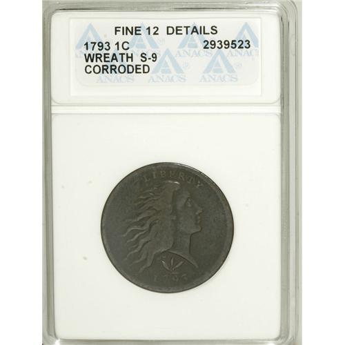 <B>1793 1C Wreath Cent--Vine and Bars, Corroded--ANACS. Fine 12 Details.</B></I> S-9, B-12, R.2. This gray-brown example has been carefully burnished to smooth the mildly porous surfaces. A nicely detailed example of this coveted early copper type. EAC 8.<BR><BR><b>Shipping:</b> Coins & Currency (<a target="_blank" href="http://www.heritageauctions.com/common/shipping.php">view shipping information</a>)