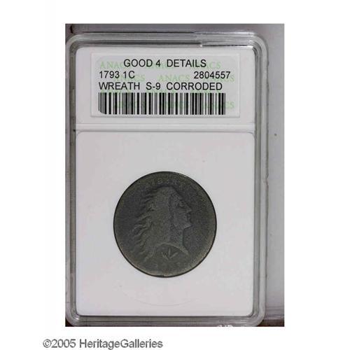 <B>1793<1C> Wreath Cent--Vine and Bars--Corroded--ANACS. Good 4 Details</B></I> S-9, B-10, R.2. Medium brown surfaces display moderate porosity over each side. The date and LIBERTY barely show, as do the reverse legends.
