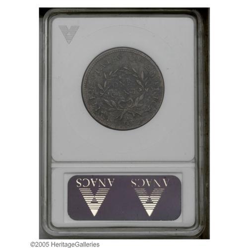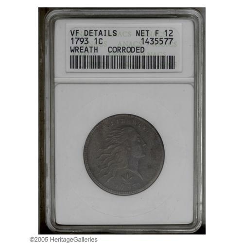 <B>1793<1C> Wreath Cent--Vine and Bars--Corroded--ANACS. VF Details, Net Fine 12.</B></I> S-9, R.2. Die State II. Golden-brown color alternates with deeper steel-blue hues. All major device details are present, and the legends and berry sprays are clear. The surfaces are moderately etched by corrosion, a pair of subdued vertical marks are in front of the profile, and a minor obverse rim ding is noted near 11 o'clock.