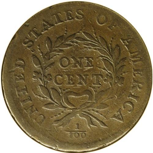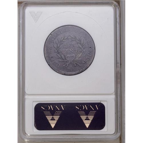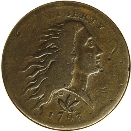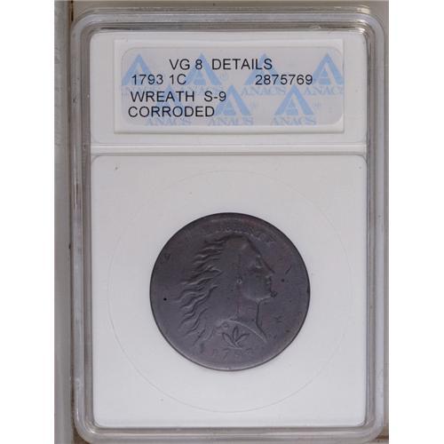 <B>1793<1C> Wreath Cent--Vine and Bars--Corroded--ANACS. VG8 Details.</B></I> S-9, B-12, R.2. A little minor porosity and a spot of green verdigris is seen on the obverse, and few ancient scratches are present on the opposite side. Still, an extremely well detailed example with medium, chocolate-brown surfaces. Well centered throughout, an affordable example of this highly collectible type coin. EAC 3.