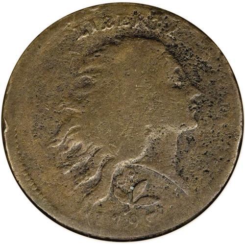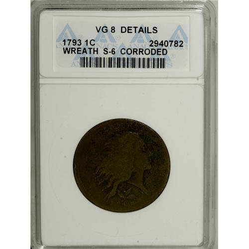 <B>1793 1C Wreath Cent--Vine and Bars--Corroded--ANACS. VG8 Details.</B></I> S-6, B-7, R.3. This chocolate-brown example is well worn, but most of the major design elements remain evident. Moderate corrosion covers both sides. The Wreath cent type was apparently Mint Director Rittenhouse's answer to newspaper criticism of the previous Chain cent design, according to Walter Breen. EAC 4.<BR><I>From The Twin Hollows Collection, Part Two.</B></I><BR><BR><b>Shipping:</b> Coins & Currency (<a target="_blank" href="http://www.heritageauctions.com/common/shipping.php">view shipping information</a>)