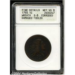 1793[1C] Wreath Cent--Vine and Bars--Corroded, Damaged, Tooled--ANACS. Fine Details, Net VG8.