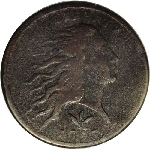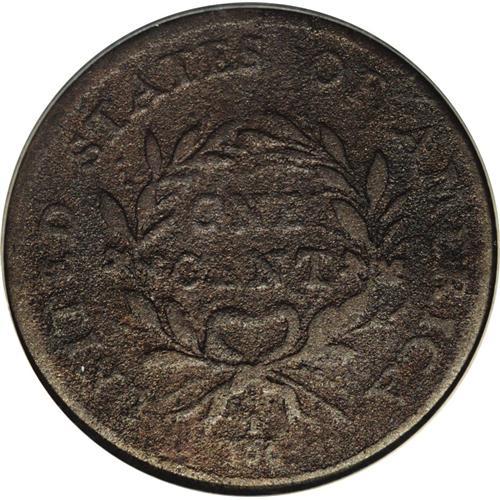 <B>1793<1C> Wreath Cent--Vine and Bars--Corroded--NCS. VF Details.</B></I> S-9, R.2. Most readily identifiable by the kidney-shaped bow on the reverse and the configuration of the sprig of leaves on the obverse. The steel-gray surfaces are extensively corroded, the worn areas over the highpoints of the obverse devices being the only areas that are unaffected. This nicely detailed coin should prove to be a bargain for some collector of early copper. EAC 6.