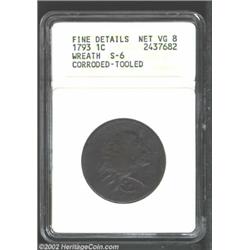1793 1C Wreath Cent--Vine and Bars--Corroded, Tooled--ANACS. Fine Details, Net VG8. S-6, R.3. The le