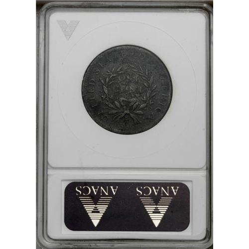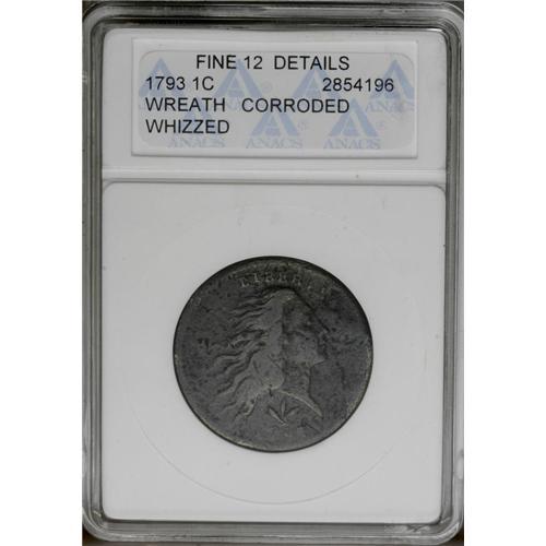 <B>1793<1C> Wreath Cent--Vine and Bars--Corroded, Whizzed--ANACS. Fine 12 Details.</B></I> S-8, B-13, R.3. This example has areas of pitting or granular surface from probable past soil exposure. Lightly whizzed to remove verdigris, but the dark brown toning is attractive and helps hide the defects. EAC 5.