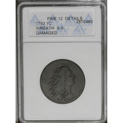<B>1793 1C Wreath Cent--Vine and Bars, Damaged--ANACS. Fine 12 Details.</B></I> S-9, B-12, R.2. Several rim bruises are evident; the most severe is on the reverse at 9 o'clock. This glossy golden-brown example is almost void of corrosion, however, and except for the denominator, all the legends are sharp. EAC 8.<BR><BR><b>Shipping:</b> Coin/Currency (<a target="_blank" href="http://www.heritageauctions.com/common/shipping.php">view shipping information</a>)