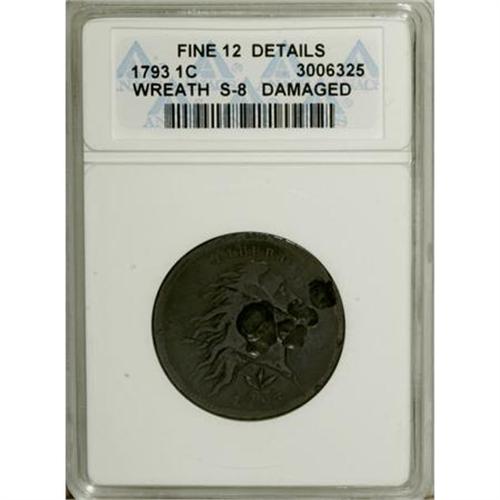<B>1793 1C Wreath Cent--Vine and Bars--Damaged--ANACS. Fine 12 Details.</B></I> S-8. NGC Census: (8/126). PCGS Population (25/252). Mintage: 63,353. Numismedia Wsl. Price for NGC/PCGS coin in F12: $3,625. (#1347)<BR><BR><B>Coin Engraver:</B> Henry Voigt<BR><BR><b>Shipping:</b> Coins & Currency (<a target="_blank" href="http://www.heritageauctions.com/common/shipping.php">view shipping information</a>)