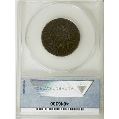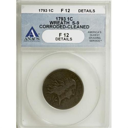 <B>1793 1C Wreath Cent--Vine and Bars--Corroded, Cleaned--ANACS. Fine 12 Details.</B></I> S-9, R.2. Slightly curved stem parallels the date, and there is a large round bow on the reverse. Light to moderate micro-porosity is visible on semi-bright golden-tan surfaces. All of the design elements are well defined. EAC 6.<BR><BR><B>Coin Engraver:</B> Henry Voigt<BR><BR><b>Shipping:</b> Coins & Currency (<a target="_blank" href="http://www.heritageauctions.com/common/shipping.php">view shipping information</a>)