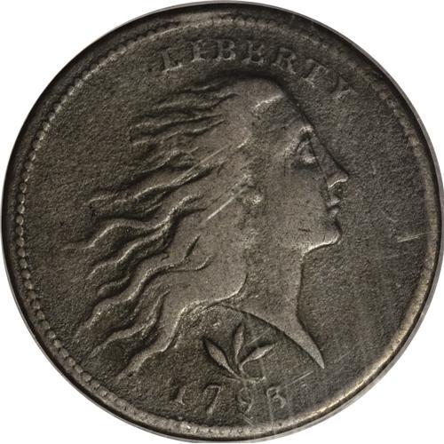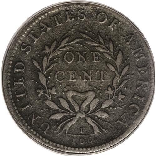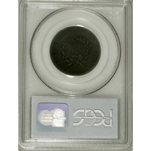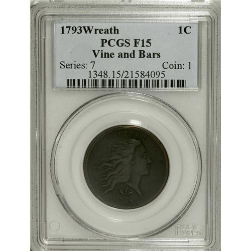 <B>1793 1C Wreath Cent--Vine and Bars--Fine 15 PCGS.</B></I> S-8, B-13, R.3. This dark lilac-brown Wreath cent has bold legends, and the wreath sprays and leaves are also well defined. The fields are consistently micro-granular, the obverse rim has a minor nick at 12 o'clock, and a faint curved mark reaches the cheek. These deficiencies are typical for the grade, and in fact there are fewer than the expected number of abrasions. EAC 8.<BR><BR><b>Shipping:</b> Coins & Currency (<a target="_blank" href="http://www.heritageauctions.com/common/shipping.php">view shipping information</a>)