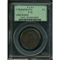 <table><tr><td><TABLE cellSpacing=0 cellPadding=0 width="100%" bgColor=#000000 border=0><TBODY> <TR><TD width="100%"><TABLE cellSpacing=1 cellPadding=3 width="100%" border=0><TBODY><TR><TD width="100%" bgColor=#79735c><FONT face=arial color=#ffffff size=3><B>Description</B> </FONT></TD></TR><TR><TD width="100%" bgColor=#ffffff><FONT face=arial size=2><B>1793 1C Wreath Cent--Vine and Bars--Fine 15 PCGS.</B></I> S-9, R.2. A later die state which has cracks (as made) through the R and CA in AMERICA. This splendidly detailed Cent has lilac-brown and tan patina, and is essentially free from granularity. A few rim dings and small planchet voids are noted for accuracy. </FONT></TD></TR></TBODY></TABLE></TD></TR></TBODY></TABLE><BR><A name=PricesRealized></A><TABLE cellSpacing=0 cellPadding=0 width="100%" bgColor=#000000 border=0><TBODY><TR><TD width="100%"><TABLE cellSpacing=1 cellPadding=3 width="100%" border=0><TBODY><TR><TD width="100%" bgColor=#79735c><A name=PR><FONT face=arial color=#ffffff size=3><B>Previous Prices from Heritage Auctions</B> </FONT></A></TD></TR><TR><TD bgColor=#f6f6ed><TABLE cellSpacing=0 cellPadding=0 width="100%" border=1><TBODY><TR><TD align=middle width="33%"><B>Date</B></TD><TD align=middle width="33%"><B>Service</B></TD><TD align=middle width="33%"><B>Price</B></TD></TR><TR bgColor=whitesmoke><TD width="33%"><B>04/05/2001</B></TD><TD width="33%">PCGS</TD><TD width="33%">$2,300.00</TD></TR><TR bgColor=whitesmoke><TD width="33%"><B>08/19/1995</B></TD><TD width="33%">PCGS</TD><TD width="33%">$1,650.00</TD></TR></TBODY></TABLE></TD></TR><TR><TD bgColor=#ffffff><FONT face=arial size=1 ?>PLEASE NOTE: All prices realized reflect the final hammer price PLUS the buyer's premium in auctions that charge a buyer's premium. Each item has a notation at the top of the listing indicating whether that lot included a buyer's premium. Example: A item that sells with a final hammer price of $100 and a 20% buyer's premium will display with a price realized of $120. All information listed is intended to be as accurate as possible, but errors are possible. Please use this guide carefully and inform us of any inaccuracies. </FONT></TD></TR></TBODY></TABLE></TD></TR></TBODY></TABLE><BR><TABLE cellSpacing=0 cellPadding=0 width="100%" bgColor=#000000 border=0><TBODY><TR><TD width="100%"><TABLE cellSpacing=1 cellPadding=3 width="100%" border=0><TBODY><TR><TD width="100%" bgColor=#79735c colSpan=6><FONT face=arial color=#ffffff size=3><B>Price Guide*</B> </FONT></TD></TR><TR bgColor=#f6f6ed><TD align=middle><B>Grade</B> </TD><TD align=middle><B>Coin World<BR>(Trends)</B> </TD><TD align=middle><B>Numismedia<BR>Retail</B> </TD><TD align=middle><B>Numismedia<BR>Wholesale</B> </TD><TD align=middle><B>Coin<BR>Universe</B> </TD><TD align=middle><B>Heritage<BR>Value Index</B> </TD></TR><TR bgColor=#ffffff><TD align=middle>12</TD><TD align=right>$4,000.00</TD><TD align=right>---</TD><TD align=right>$2,250.00</TD><TD align=right>$2,900.00</TD><TD align=right>$2,446.25</TD></TR><TR style="FONT-WEIGHT: bold" bgColor=#cccfdd><TD align=middle>15</TD><TD align=right>---</TD><TD align=right>---</TD><TD align=right>---</TD><TD align=right>---</TD><TD align=right>$2,908.96</TD></TR><TR bgColor=#ffffff><TD align=middle>20</TD><TD align=right>$6,000.00</TD><TD align=right>---</TD><TD align=right>$3,675.00</TD><TD align=right>---</TD><TD align=right>$4,136.67</TD></TR><TR bgColor=#ffffff><TD colSpan=6><FONT size=1>*All information listed is intended to be as accurate as possible, but errors are possible. No item may be returned or refused based on this information which is provided as a service to our customers. You should contact each pricing source directly to determine the accuracy of this information. </FONT></TD></TR></TBODY></TABLE></TD></TR></TBODY></TABLE><BR><TABLE cellSpacing=0 cellPadding=0 width="100%" bgColor=#000000 border=0><TBODY><TR><TD width="100%"><TABLE cellSpacing=1 cellPadding=3 width="100%" border=0><TBODY><TR><TD width="100%" bgColor=#79735c><FONT face=arial color=#ffffff size=3><B>Population Guide</B> </FONT></TD></TR><TR bgColor=#ffffff><TD align=middle><!-- Begin Output of Population Grid--><TABLE cellSpacing=0 cellPadding=0 width="100%" border=0><TBODY><TR><TD vAlign=center><TABLE cellSpacing=0 width="100%" border=1 cellsadding="3"><TBODY><TR><TD vAlign=center><TABLE cellSpacing=0 cellPadding=3 width="100%" border=1><TBODY><TR><TD vAlign=center align=middle bgColor=#f0f1e8 colSpan=2 <CENTER><FONT face=Arial size=2><B>PCGS Pop </B></FONT><CENTER></CENTER></TD><TD vAlign=center align=middle bgColor=#f0f1e8 colSpan=2><CENTER><FONT face=Arial size=2><B>NGC Pop</B></CENTER></FONT></TD></TR><TR><TD vAlign=center><FONT face=Arial size=2>(15)</FONT> </TD><TD vAlign=center align=right><FONT face=Arial size=2>30</FONT> </TD><TD vAlign=center><FONT face=Arial size=2>(15)</FONT> </TD><TD vAlign=center align=right><FONT face=Arial size=2>4</FONT> </TD></TR><TR><TD vAlign=center><FONT face=Arial size=2>(>15)</FONT> </TD><TD vAlign=center align=right><FONT face=Arial size=2>198</FONT> </TD><TD vAlign=center><FONT face=Arial size=2>(>15)</FONT> </TD><TD vAlign=center align=right><FONT face=Arial size=2>85</FONT> </TD></TR></TBODY></TABLE></TD></TR></TBODY></TABLE></TD></TR></TBODY></TABLE><!-- End Output of Population Grid--></TD></TR></TBODY></TABLE></TD></TR></TBODY></TABLE><BR><TABLE cellSpacing=0 cellPadding=0 width="100%" bgColor=#000000 border=0><TBODY><TR> Important notice: Heritage usually auctions material at the rate of 200-250 lots per hour. On some occasions eBay Live bid software or the Internet may not be able to keep up with the pace of the auction. We recommend placing a realistic absentee bid now as insurance to avoid disappointment. Occasionally the auctioneer may eliminate or reject an eBay Live bid, and the auctioneer may also reopen a lot after the close of the eBay live bidding (usually because we missed an audience bid), and may reject your bid even if it shows you as the winni