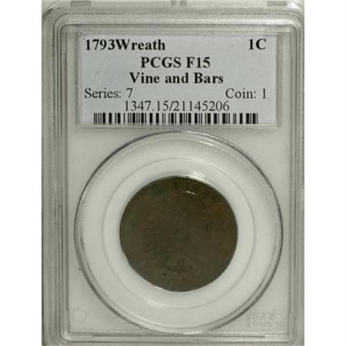 <B>1793 1C Wreath Cent--Vine and Bars--Fine 15 PCGS.</B></I> S-5, B-6, R.4. A scarcer Wreath cent variety, more difficult to locate than the usual S-9, S-8, and S-6 marriages. The large letters in LIBERTY immediately identify S-5. This chocolate-brown example has sharp legends aside from the base of the date. The only relevant marks are a tiny dig above the 1 and a minor rim bruise on the reverse at 6:30. EAC 8.<BR><I>From The Arnold & Harriet Collection.</B></I><BR><BR><B>Coin Engraver:</B> Henry Voigt<BR><BR><b>Shipping:</b> Coins & Currency (<a target="_blank" href="http://www.heritageauctions.com/common/shipping.php">view shipping information</a>)