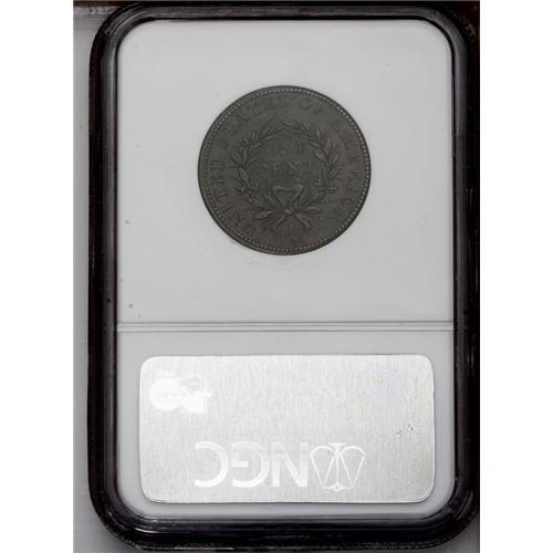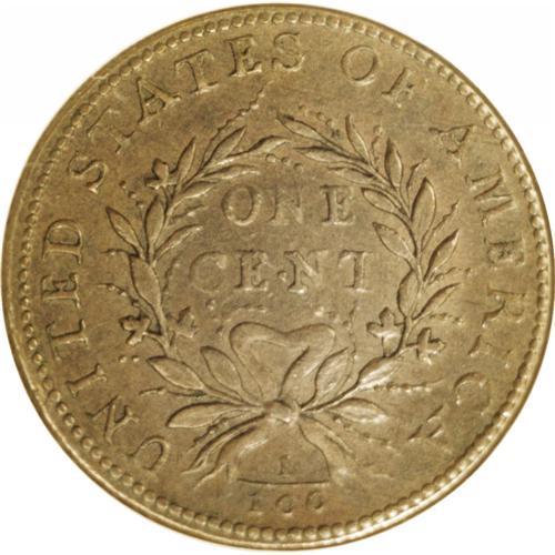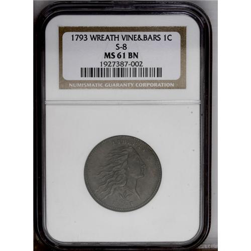 <B>1793 1C Wreath Cent--Vine and Bars--MS61 Brown NGC.</B></I> S-8, Low R.3. The scarcer of the two collectible Obverse 9 varieties, Sheldon-8 is distinguished from Sheldon-9 by the reverse bow, which is triangular rather than heart-shaped. Sheldon-5 through Sheldon-11 comprise the collectible Wreath cent varieties, which were only struck in 1793, the first year of Large cent production at the fledgling U.S. Mint in Philadelphia. Although Wreath cents are not especially rare in worn out or corroded condition, Mint State survivors are few and far between, and under tremendous demand both from copper specialists and early type set collectors. The present piece offers consistent medium brown color, and is unusually void of contact, since a wispy obverse pinscratch at 7:30 is all that can be found. A few minor planchet flaws between 2 and 3 o'clock on the obverse are of mint origin. Not fully struck, but all major details are evident. Luster shimmers when the piece is rotated beneath a light. A significant opportunity for the Early American enthusiast. EAC 45.