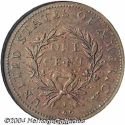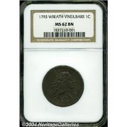 <B>1793<1C> Wreath Cent--Vine and Bars--MS62 Brown NGC.</B></I> S-8, Low R.3. After the Chain cents were released to the public and received criticism for their design, the fledgling United States Mint went into quick action and developed an entirely new design to satisfy public demand. It is generally conceded that the Chain cents were produced in early March and were included with the coinage deliveries dated from March 1 through March 12. After that, the first delivery of Wreath cents was dated April 9, thus the Mint's reaction to the public commentary took less than a month. This included the development of a new design concept and preparation of new dies. This was a short period of time to accomplish these tasks with the technology in place 200 years ago.<BR> The actual person who engraved the dies for the different Wreath cent varieties is not specifically known. Walter Breen believed that it was either Adam Eckfeldt or the artist named Birch who prepared the large size 1792 cent patterns. In his <I>Large Cent Encyclopedia,</B></I> he stated: "The actual diesinker is uncertain. It was not Voigt as the style is too different from the Chains. Neither Joseph Wright nor Robert Scot had yet been hired. This leaves only two likely candidates: Birch and Adam Eckfeldt. In favor of Eckfeldt is the close kinship between these reverses and those of the half cents of 1793, which Eckfeldt claimed as his own work. In favor of Birch is the kinship between the seven cent reverses and that of the Birch and Voigt cents of 1792." Alternatively, R.W. Julian suggested that Voigt probably prepared the Wreath cent dies, perhaps with some help from Eckfeldt. In his note to the editor of the Breen cent book, Julian stated his opinion that Eckfeldt was probably not the actual engraver who did the dies, for if he had been, he would have filled the engraver's position at the mint and received the appropriate salary.<BR> This example is the Sheldon-8 die combination, which is moderately scarce, although several high quality examples survive. This has smooth olive-brown surfaces with hints of orange color and grayish-brown toning on the high points. This is a strong and evenly centered impression with complete border details on both sides and an excellent margin all around, outside the border beads. A tiny reverse rim scrape below the fraction is the only significant flaw. <BR><BR><B>Important notice:</B> Heritage usually auctions material at the rate of 200-250 lots per hour. On some occasions eBay Live bid software or the Internet may not be able to keep up with the pace of the auction. We recommend placing a realistic absentee bid now as insurance to avoid disappointment. Occasionally the auctioneer may eliminate or reject an eBay Live bid, and the auctioneer may also reopen a lot after the close of the eBay live bidding (usually because we missed an audience bid), and may reject your bid even if it shows you as the winning bidder. By bidding via eBay Live, you agree that Heritage may award the lot to another bidder at its sole discretion under the circumstances described above or any other reasonable circumstances. Since eBay bids are not shown to us until we open the lot on the floor, we treat those bids just like floor bids. In most cases the floor responds before the eBay bid is presented to us, due to Internet lag time, so for consistency we have made it a policy that floor bids are always considered first over tie eBay live bids. Also please note that all Heritage lots purchased through eBay Live carry a 20% Buyer's Premium. Please make sure you read the Terms and Conditions before you bid.