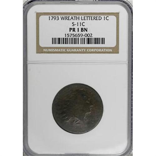 <B>1793 1C Wreath Cent--Vine and Bars-- P1 NGC.</B></I> S-11C. NGC Census: (2/160). PCGS Population (2/398). Mintage: 63,353. (#1347)<BR><BR><B>Coin Engraver:</B> Henry Voigt<BR><BR><b>Shipping:</b> Coins & Currency (<a target="_blank" href="http://www.heritageauctions.com/common/shipping.php">view shipping information</a>)
