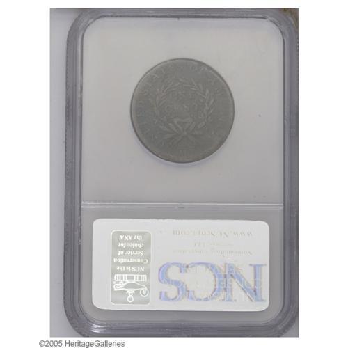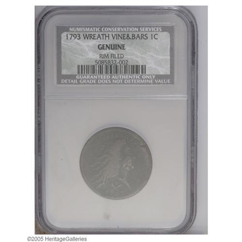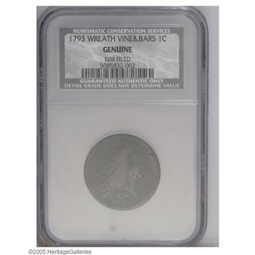 <B>1793<1C> Wreath Cent--Vine and Bars--Rim Filed--NCS. Genuine.</B></I> S-8, Low R.3. NCS has not assigned this first year Large Cent a Details grade, however, we suggest that Fine Details is appropriate. The right border and the right edge exhibit heavy file marks on both sides, in addition, this lavender-brown example shows consistent light corrosion and has small spots near the 1 in the date and on the cheekbone. Obverse contact marks on the jaw and at 2 o'clock are also noted.