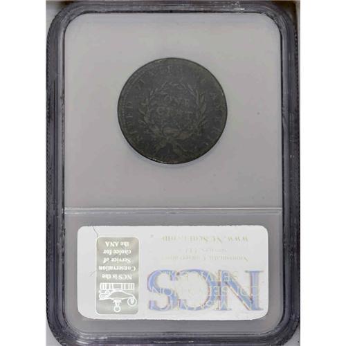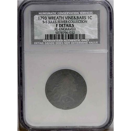 <B>1793<1C> Wreath Cent--Vine and Bars--S-5, B-6, Low R.4--Re-Engraved--NCS. Fine Details. AG3 EAC.</B></I> Large Date and LIBERTY. The size of the date and LIBERTY are unique to this obverse die among the Wreath Cents. Although it is perhaps impossible to precisely determine the die state, it appears to be quite early. Despite the overall condition, a few dentils over L of LIBERTY appear to be visible, with no evidence of rim crumbling at that location. Intermingled olive and steel-brown color with generally smooth surfaces. Minor rim bruises and slight re-engraving at the date lead to a reduced EAC net grade for this example.<BR><I>Ex: Denis W. Loring (8/1971).</B></I> Envelope Included.
