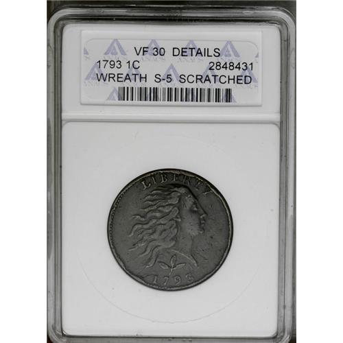 <B>1793<1C> Wreath Cent--Vine and Bars, Scratched--ANACS. VF30 Details.</B></I> S-5, B-6, R.4. The glossy medium brown surfaces have scant indication of corrosion, and the types and legends are clear. Several small dings affect the rims, and there are a number of light to moderate pinscratches, particularly near the E in CENT. EAC 8.